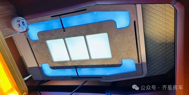 航空座椅集成座椅通風(fēng)、加熱、按摩獨(dú)立腿托功能,前面會(huì)客桌板可以延展,內(nèi)部升頂星空頂造型包覆了溫馨氛圍燈,生活區(qū)頂部及側(cè)圍進(jìn)行了造型軟包,副駕駛旋轉(zhuǎn)過(guò)來(lái)可以組成完整會(huì)客區(qū),后排的雙人座椅可實(shí)現(xiàn)靠背倒伏組合成單獨(dú)的縱置床鋪,縱床區(qū)域還安裝KME的房車變頻空調(diào)。