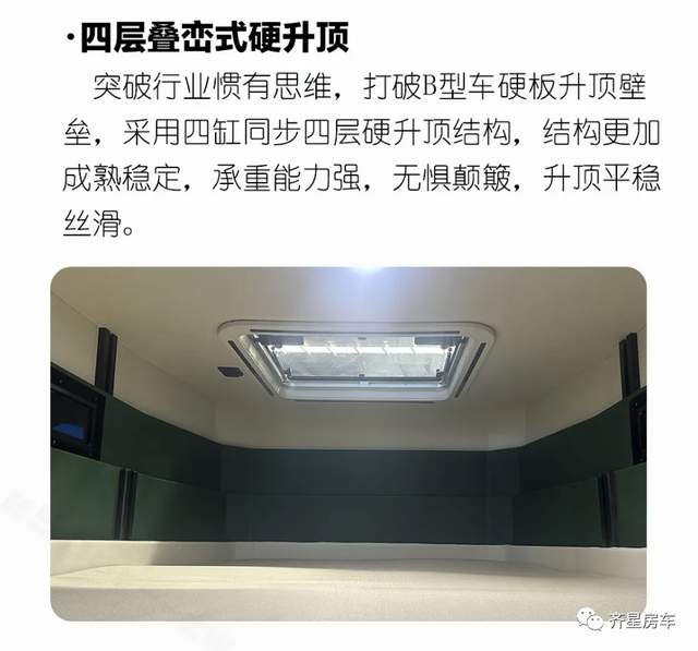 采用齊星成熟四柱電動(dòng)硬升頂結(jié)構(gòu),在保溫隔熱與便利性同時(shí)完善了整車的防水性,只需通過(guò)一鍵升頂,內(nèi)高可以達(dá)到2米,方便駐車狀態(tài)的起居活動(dòng)空間,內(nèi)外雙升頂?shù)慕M合,讓二層升頂可以形成一張1950x1150mm雙人床,雖然是硬升頂?shù)倪B接結(jié)構(gòu)也貼心安裝了側(cè)面采光窗與頂部的房車天窗。