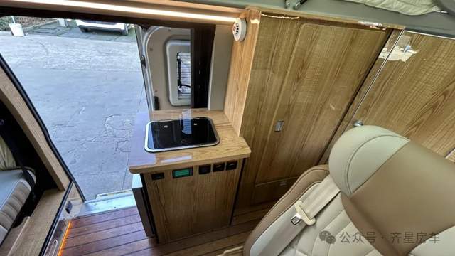 進(jìn)門的吧臺(tái)區(qū)域集成了不銹鋼洗菜池,滑門進(jìn)門下方嵌入48L房車冰箱,形成了一條動(dòng)線的簡(jiǎn)餐吧臺(tái),會(huì)客起居空間貫通,整體通透整潔。